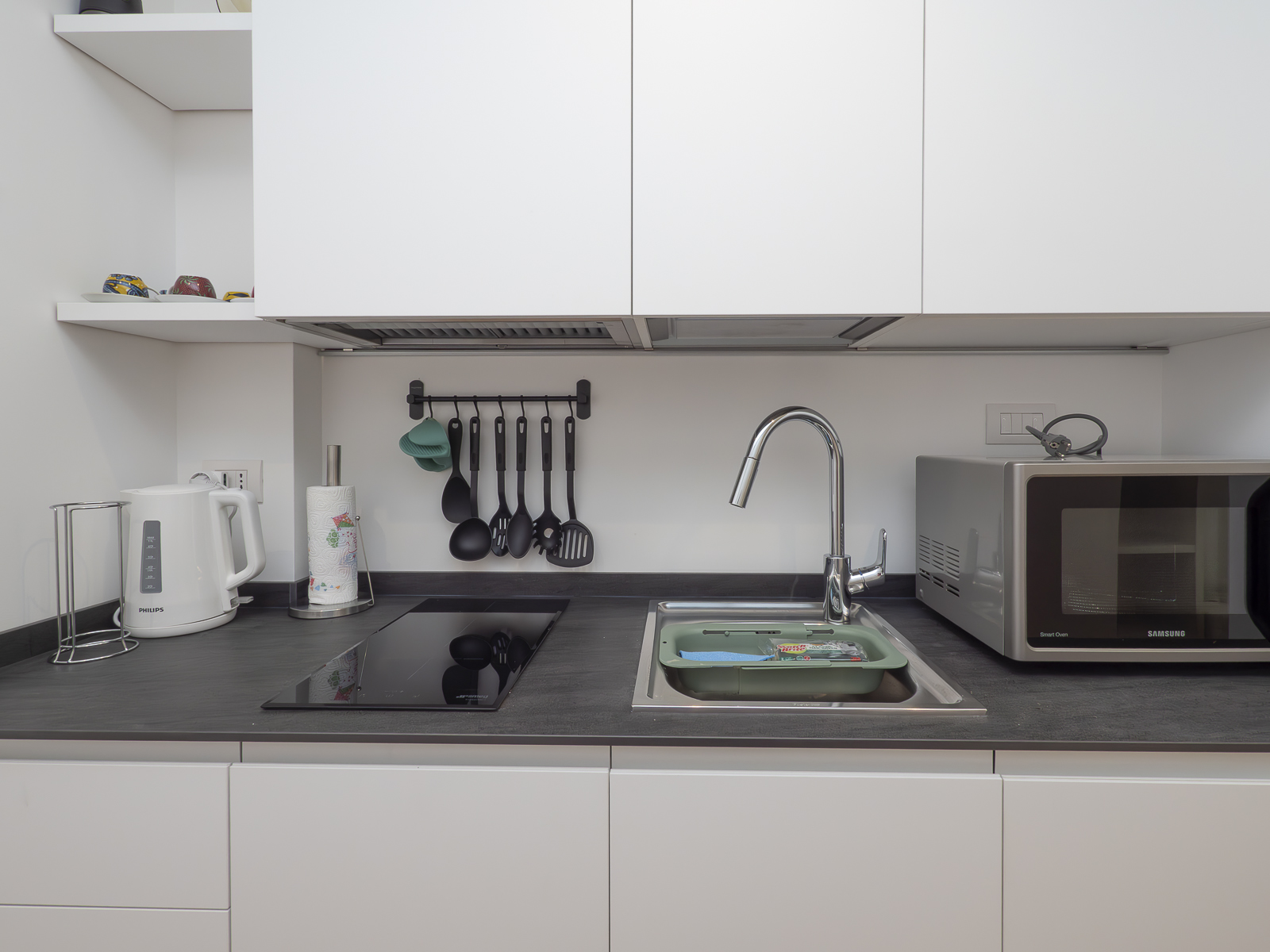 - Cucina attrezzata e corredata con induzione 2 fuochi, lavastoviglie, forno e microonde, bollitore, moka, macchina caffè in capsule e set completo di utensili da cucina