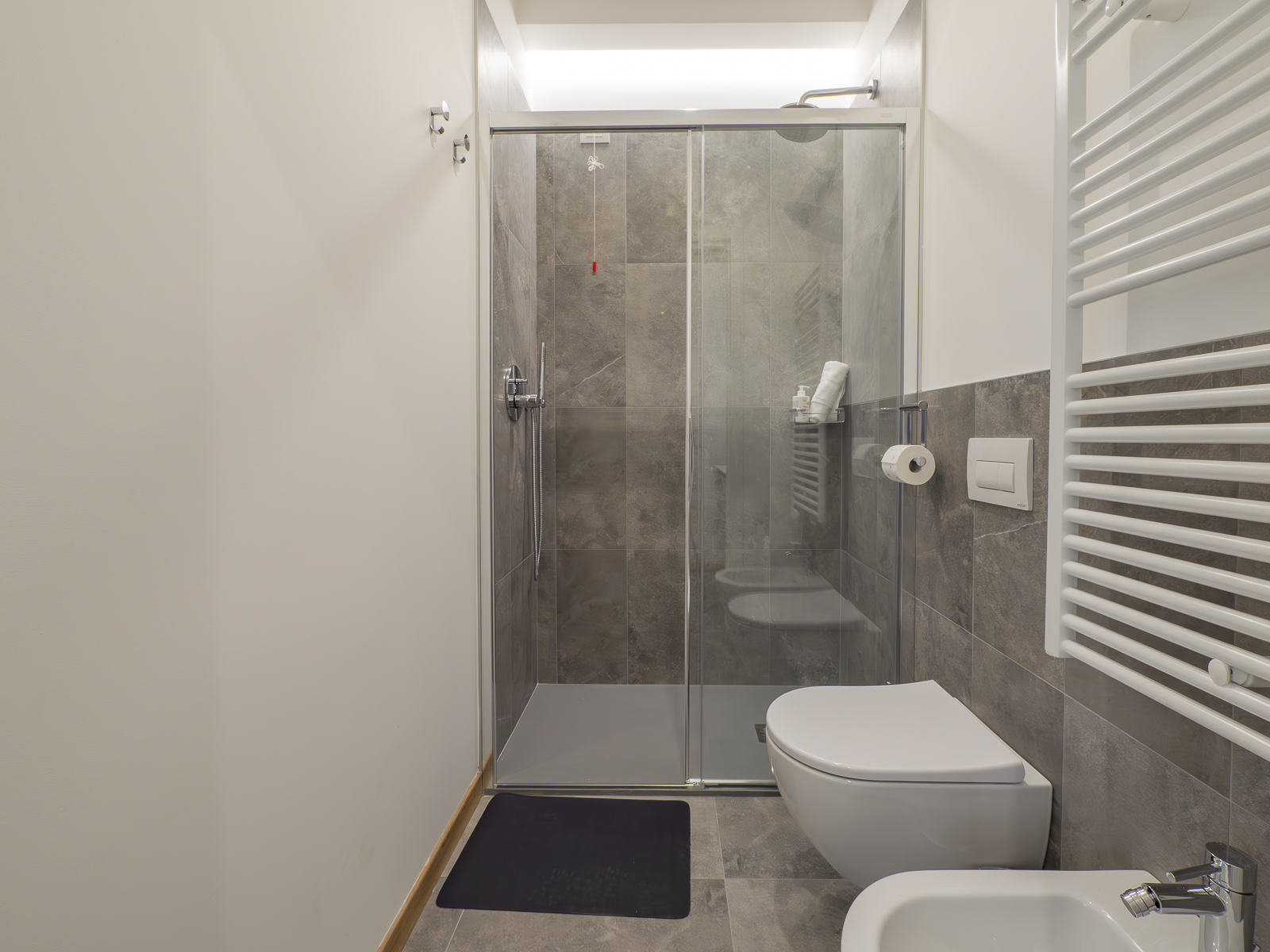 - Bagno elegante, grande, moderno, con mensola portaoggetti, grande box doccia, asciugacapelli