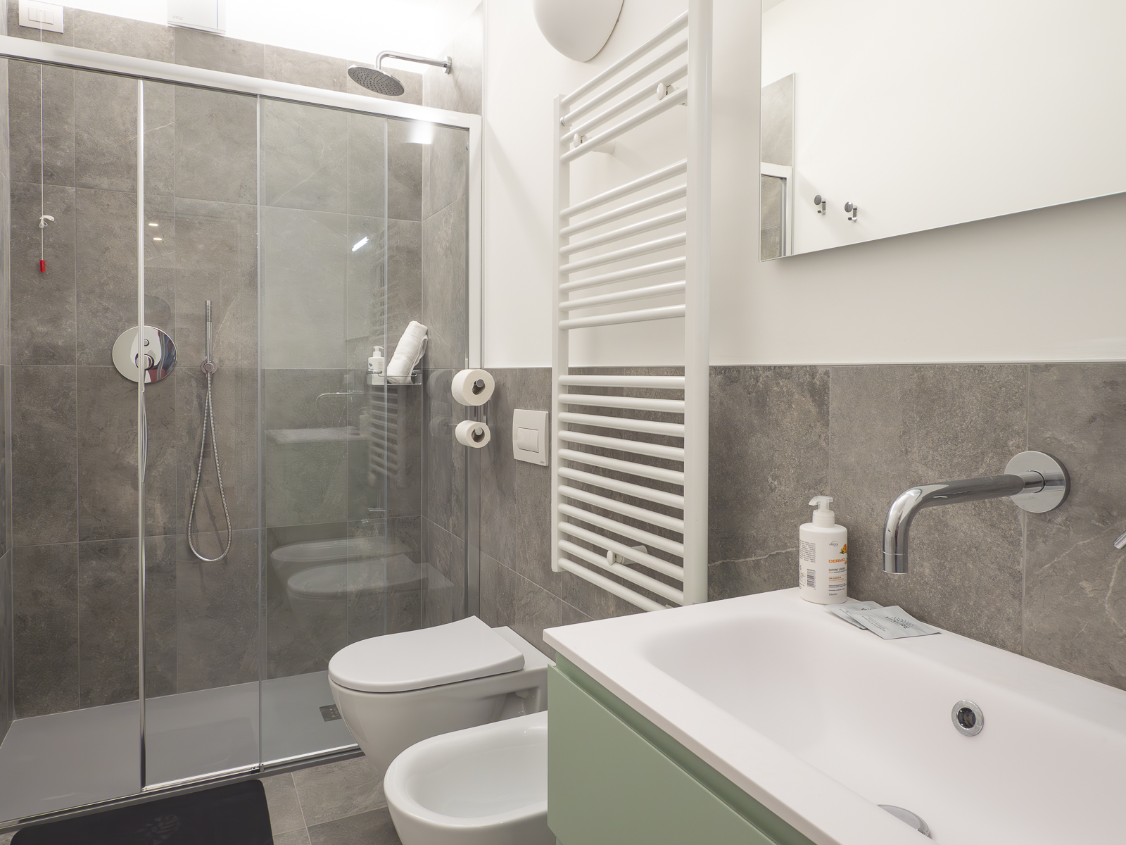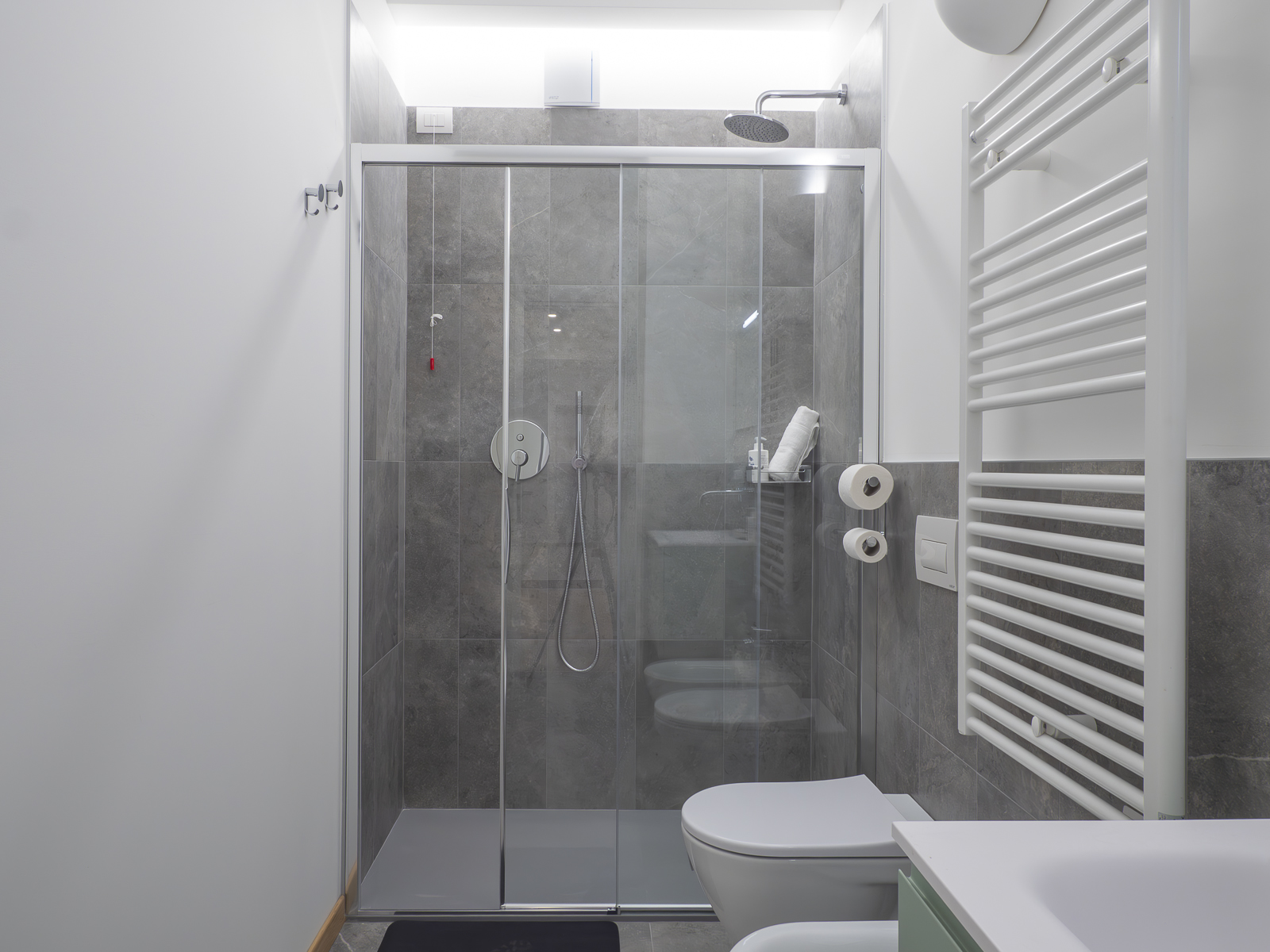 - Bagno elegante, grande, moderno, con mensola portaoggetti, grande box doccia, asciugacapelli