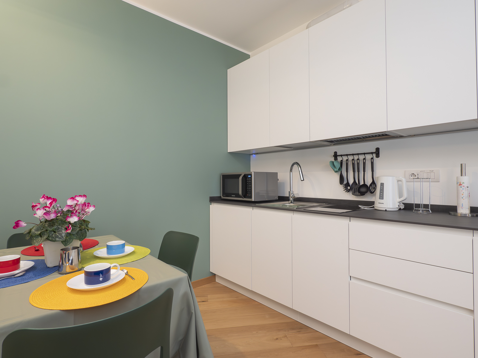 - Cucina attrezzata e corredata con induzione 2 fuochi, lavastoviglie, forno e microonde, bollitore, moka, macchina caffè in capsule e set completo di utensili da cucina