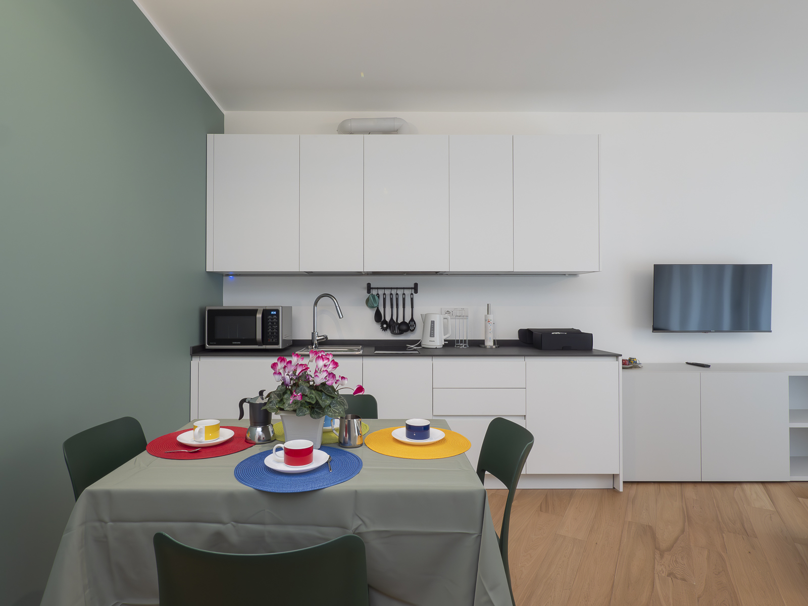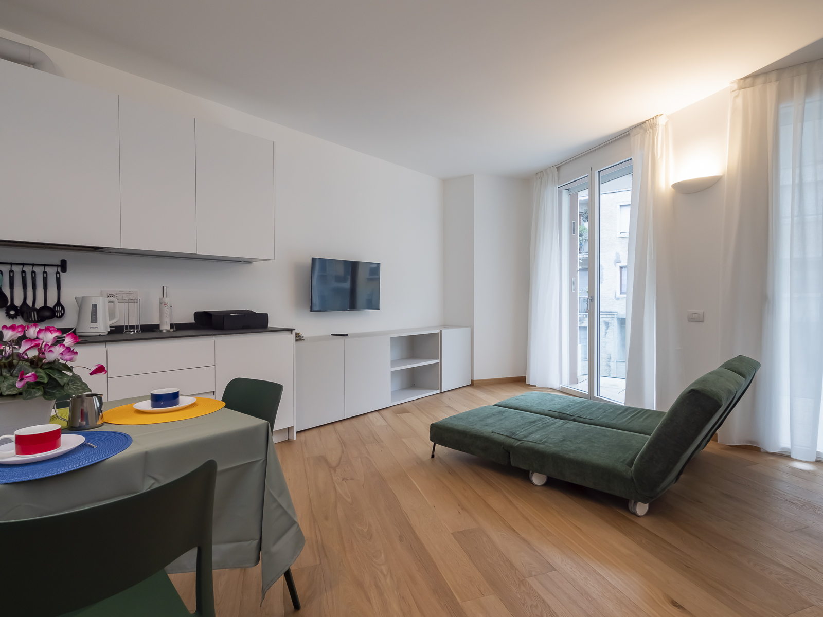 This minimalist studio apartment is designed to offer a high-end residence with a living room equipped with two comfortable armchairs that convert into chaise longues, a large, comfortable fold-down double bed and a smart TV, a fully equipped kitchen, wardrobes and drawers, a washer/dryer, ironing board and iron, and a large balcony/terrace with plants for moments of relaxation.