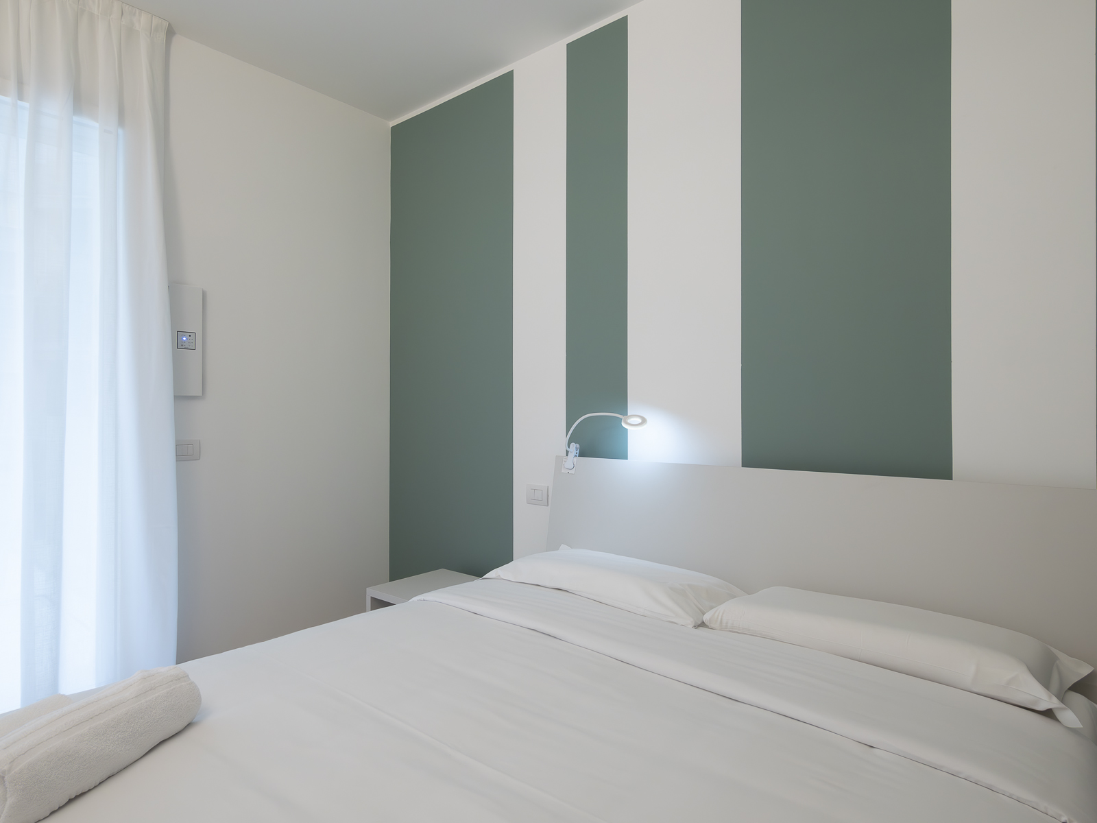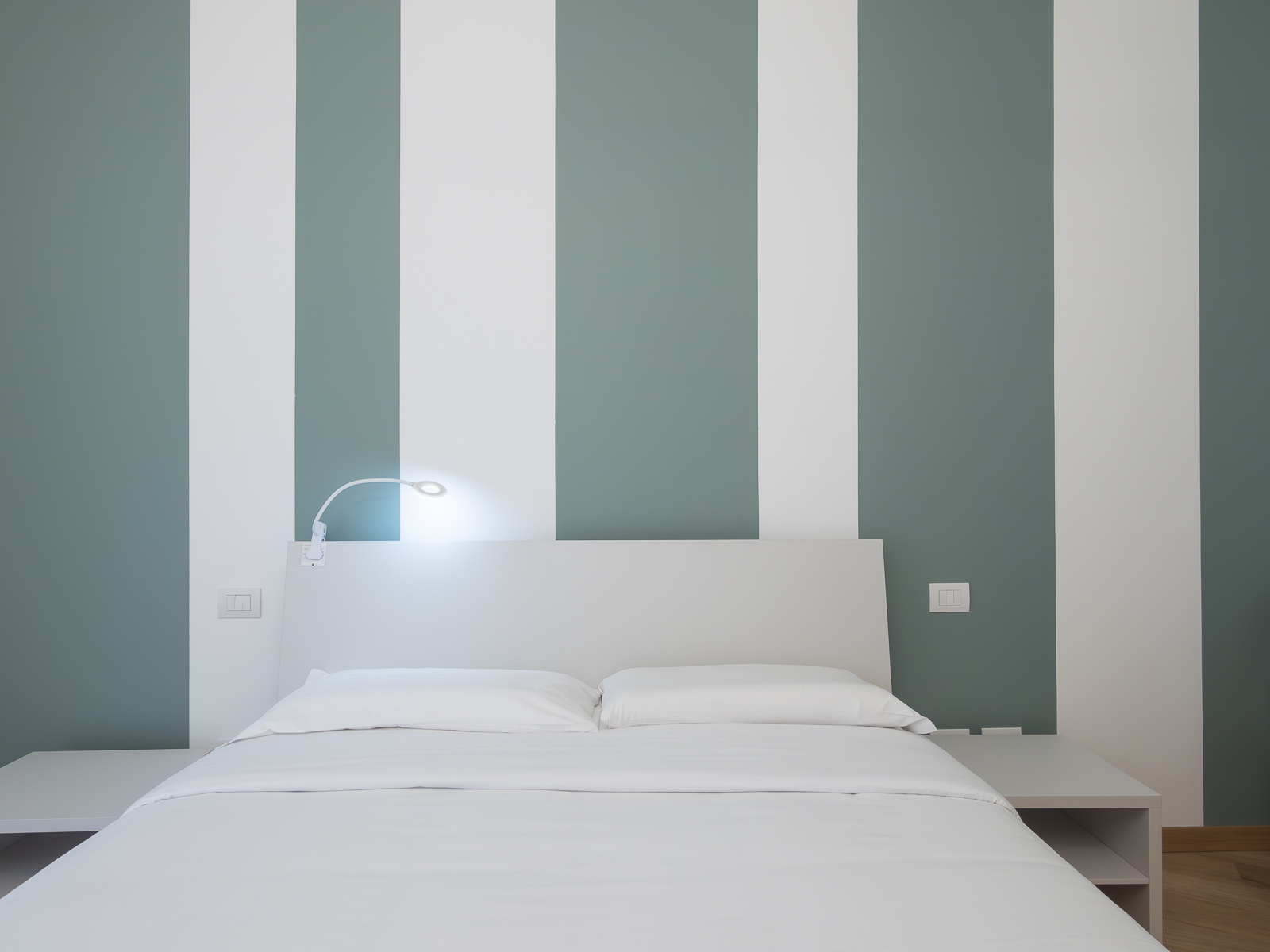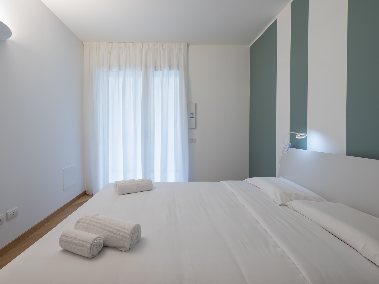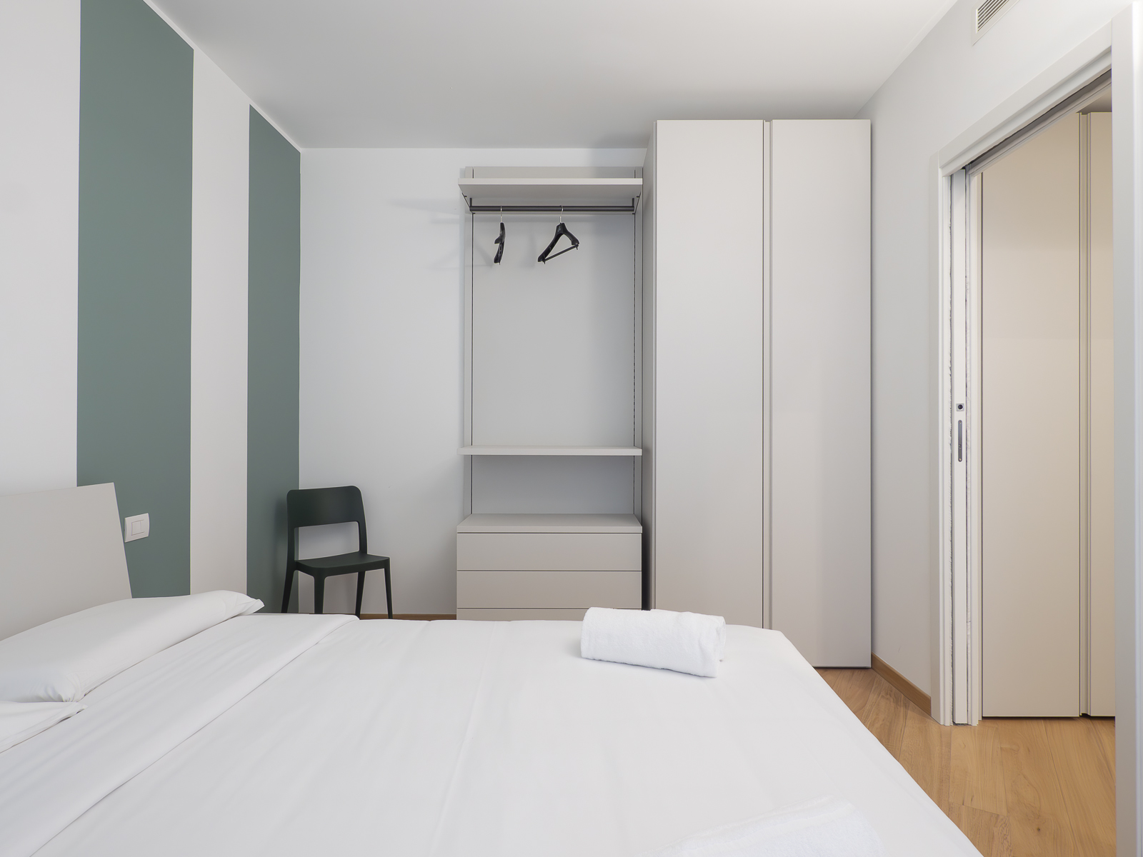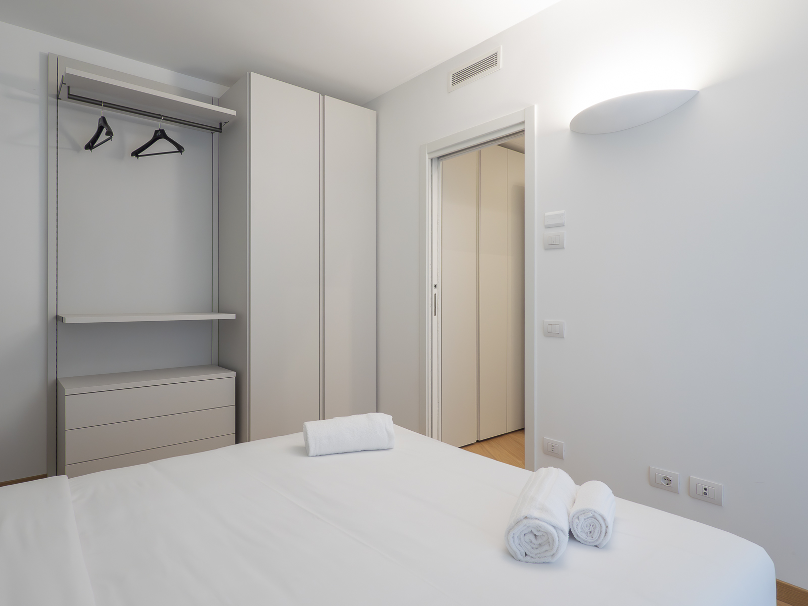 - Bedroom with double bed with high-quality bed linen, duvet, pillows and pillowcases, spacious wardrobe and designer lamps.